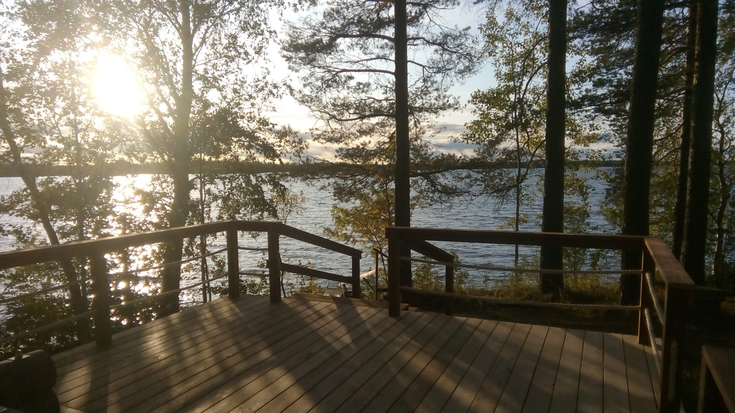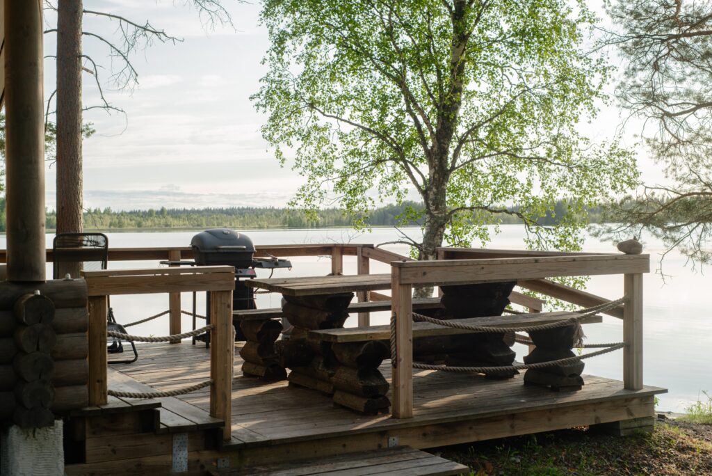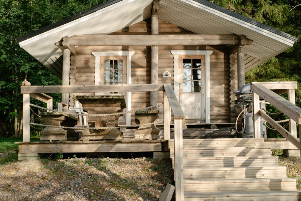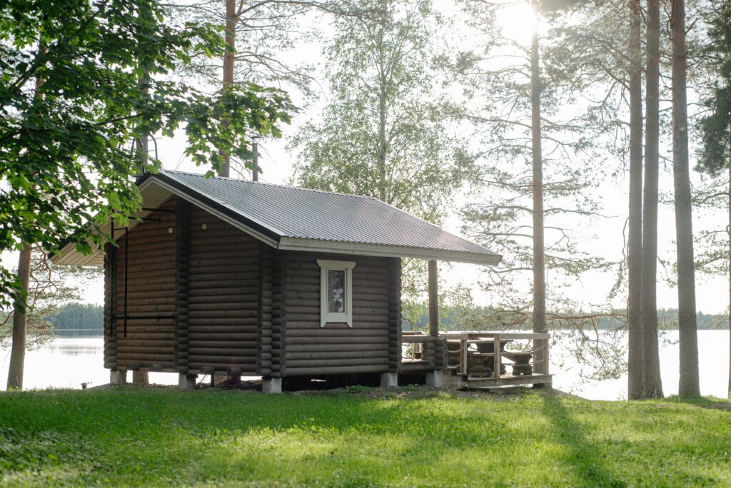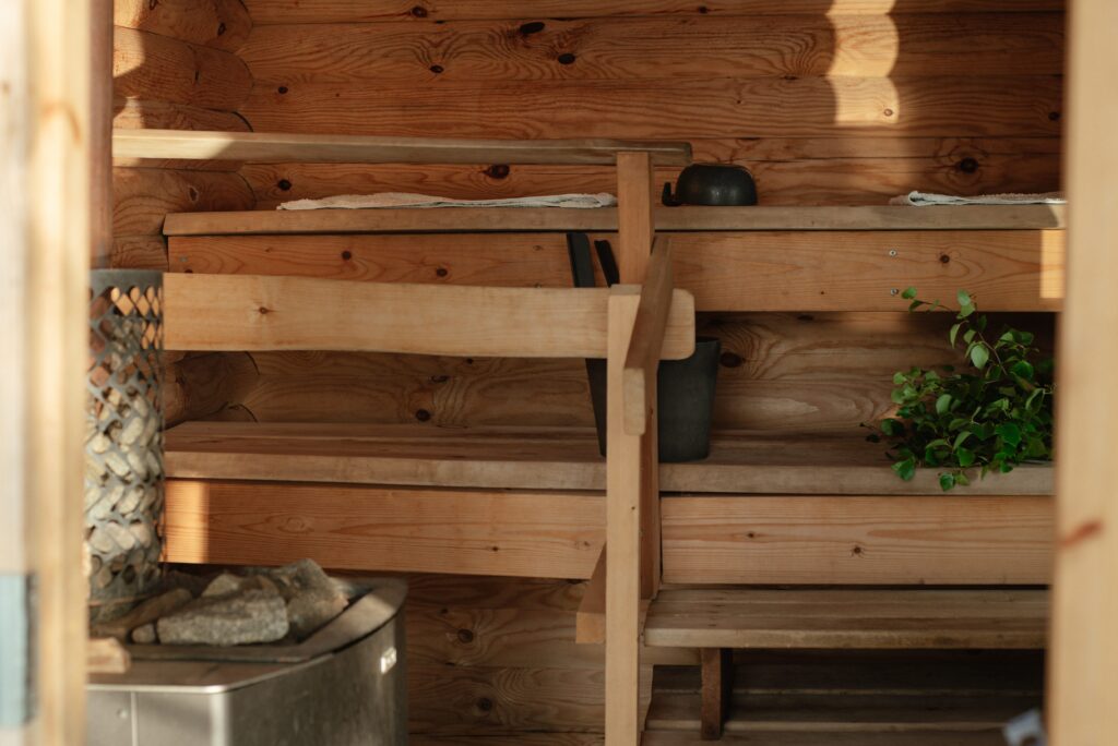 Pyöröhirsiseen saunaan sopii kerralla noin 5-6 aikuista. Saunan yhteydessä saunakammari jota voi käyttää pukeutumistilana.